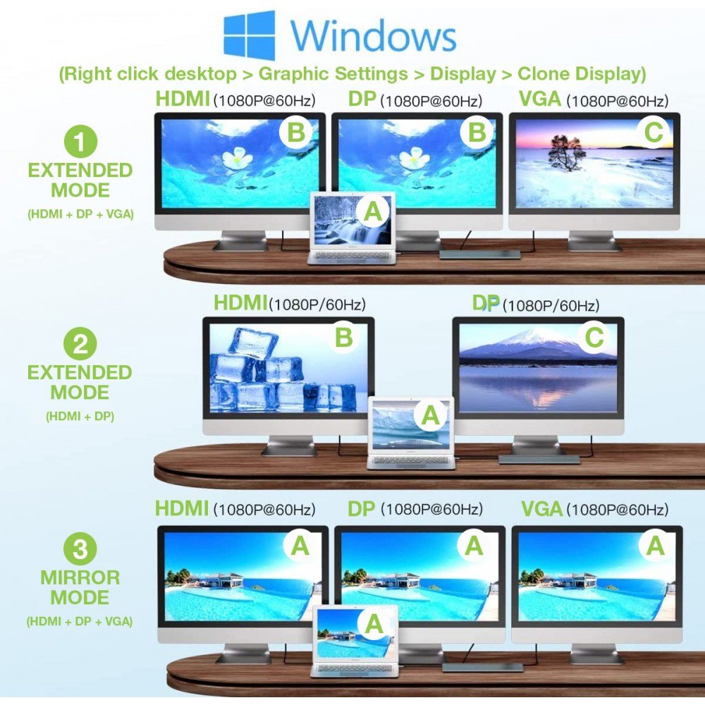 - Umożliwia jednoczesne podłączenie do laptopa lub PC trzech zewnętrznych w wyświetlaczy w trybie rozszerzenia lub duplikacji ekranu