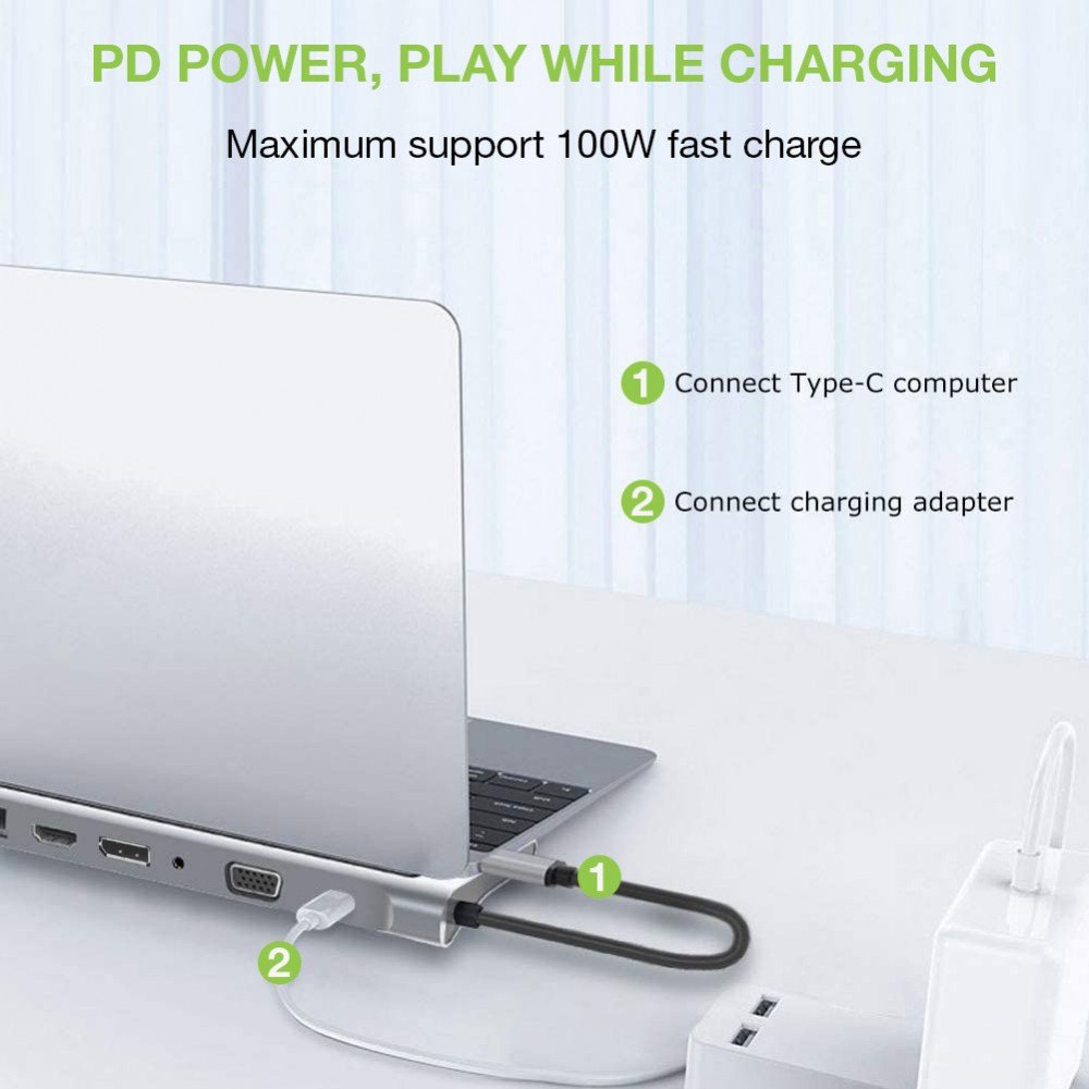 - Obsługuje funkcję USB-C Power Delivery o mocy do 100W, która umożliwia ładowanie laptopa podczas korzystania ze stacji dokującej