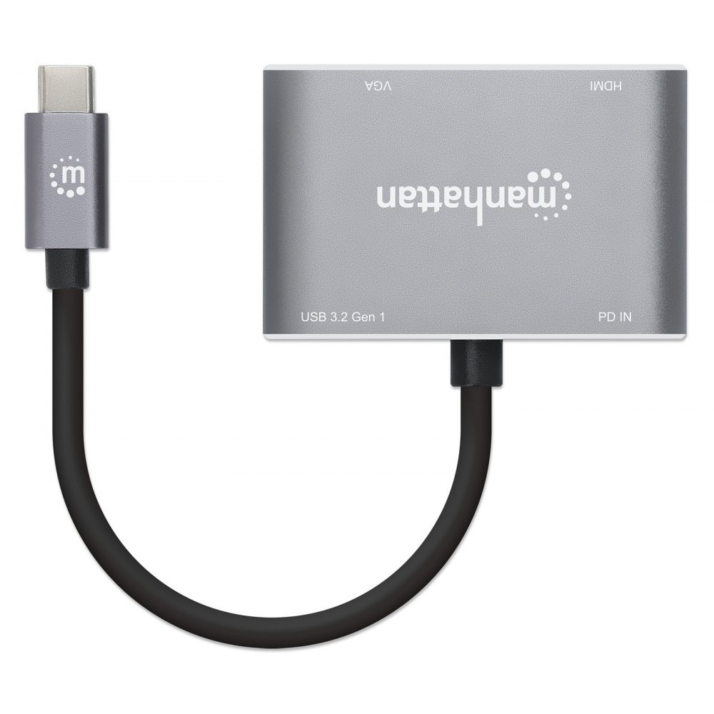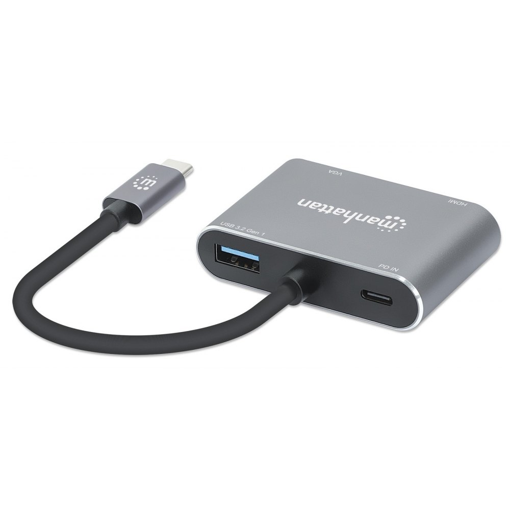 Przejściówka USB-C Manhattan 130691 – Hub Adapter USB-C 3.2 Gen1 na HDMI 4K*30Hz, VGA 1080p, USB-A 5Gbps, z Funkcją Zasilania USB-C Power Delivery 87W