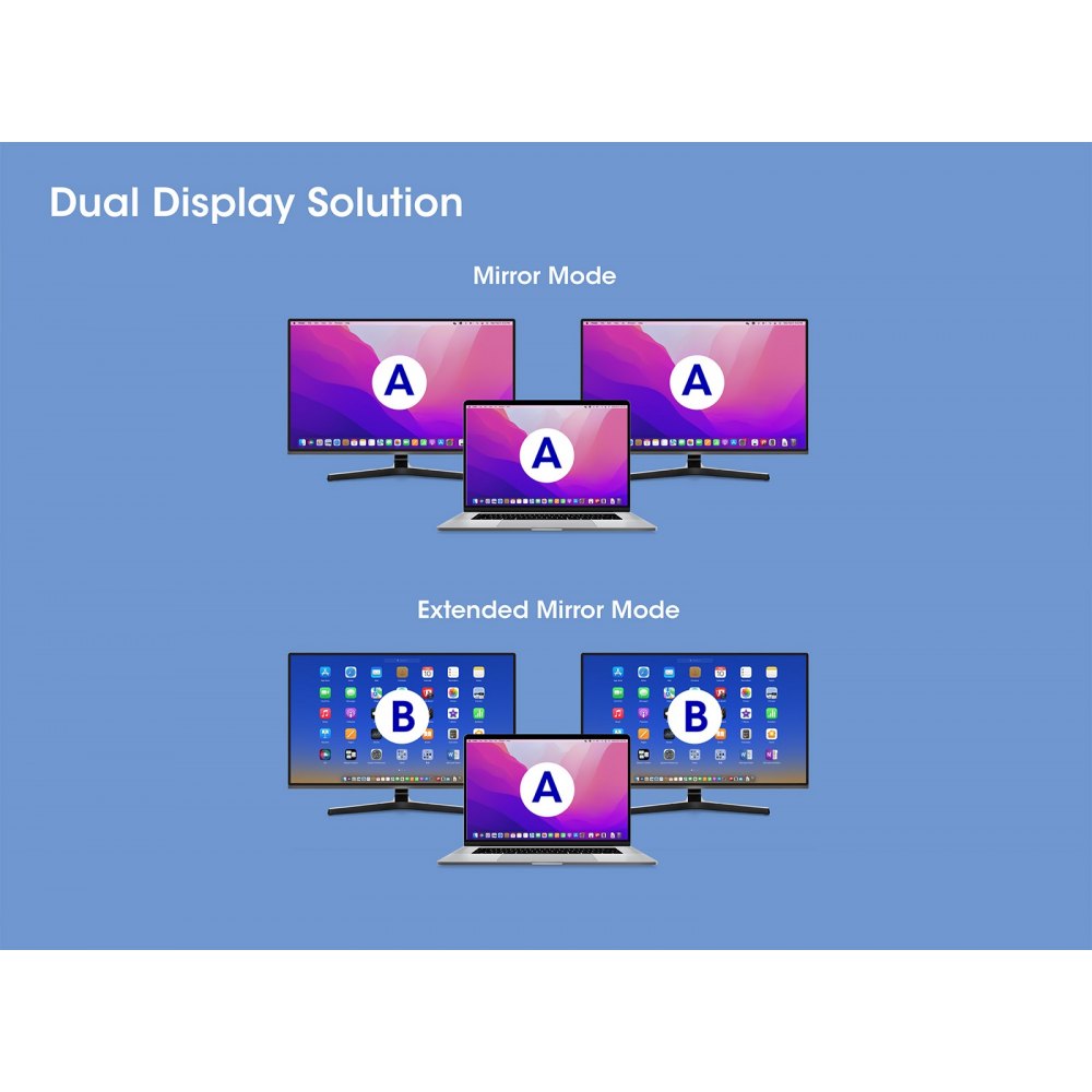 - Umożliwia podłączenie do laptopa dwóch monitorów, jednego urządzenia USB oraz jednoczesne ładowanie laptopa