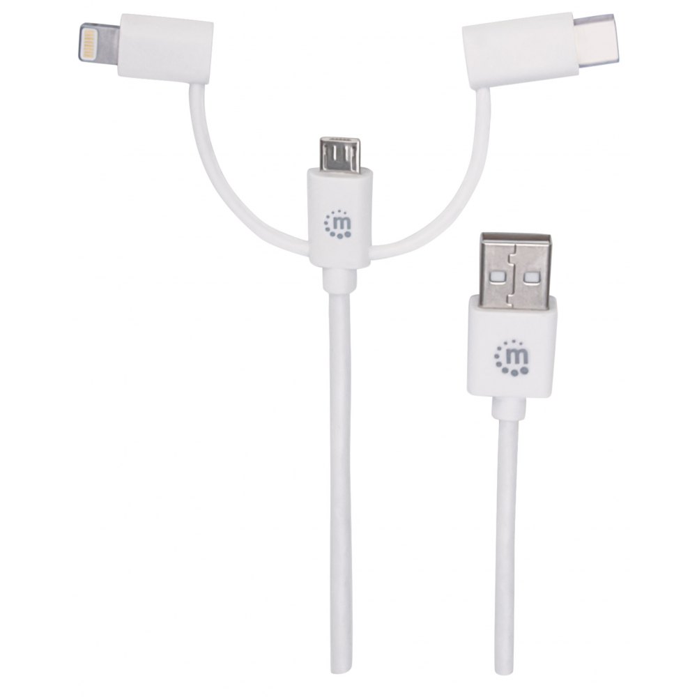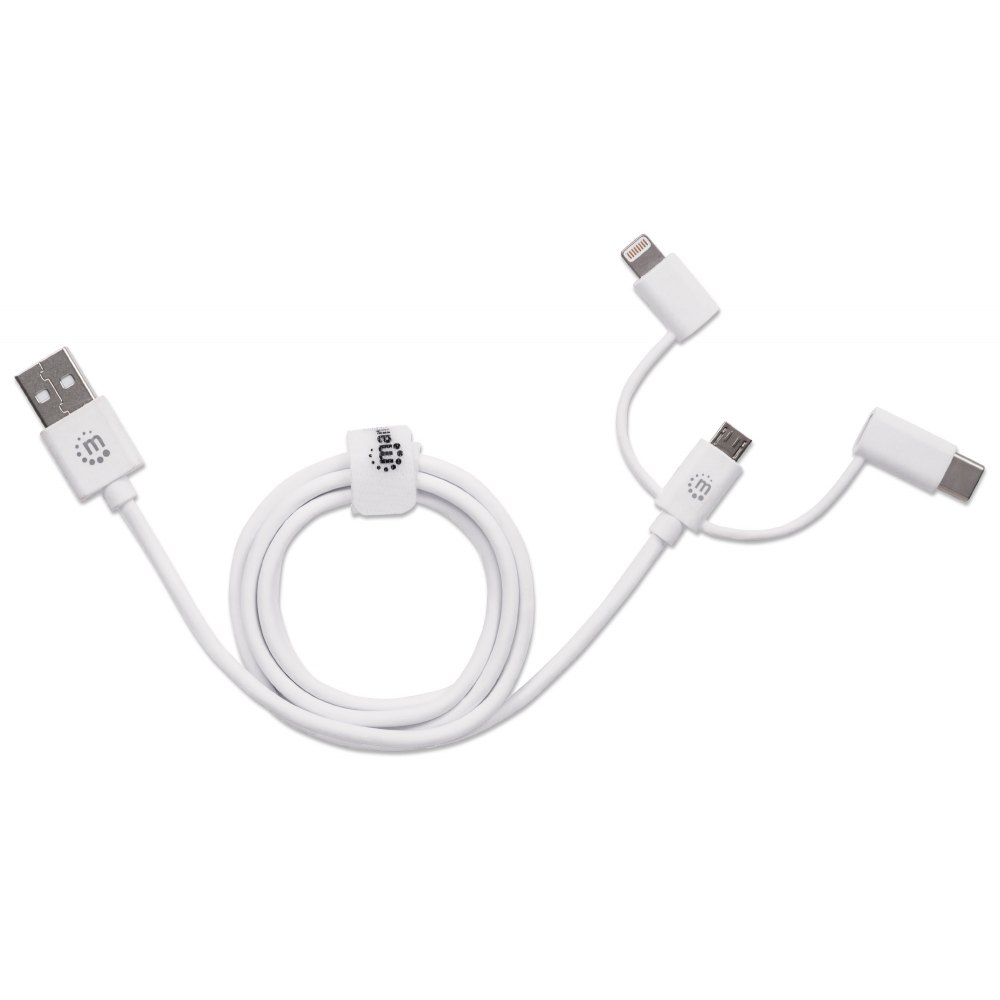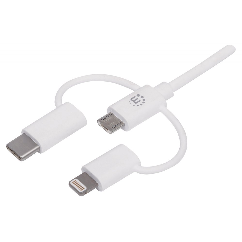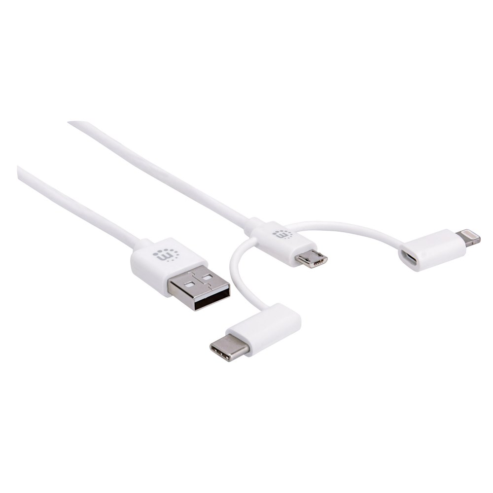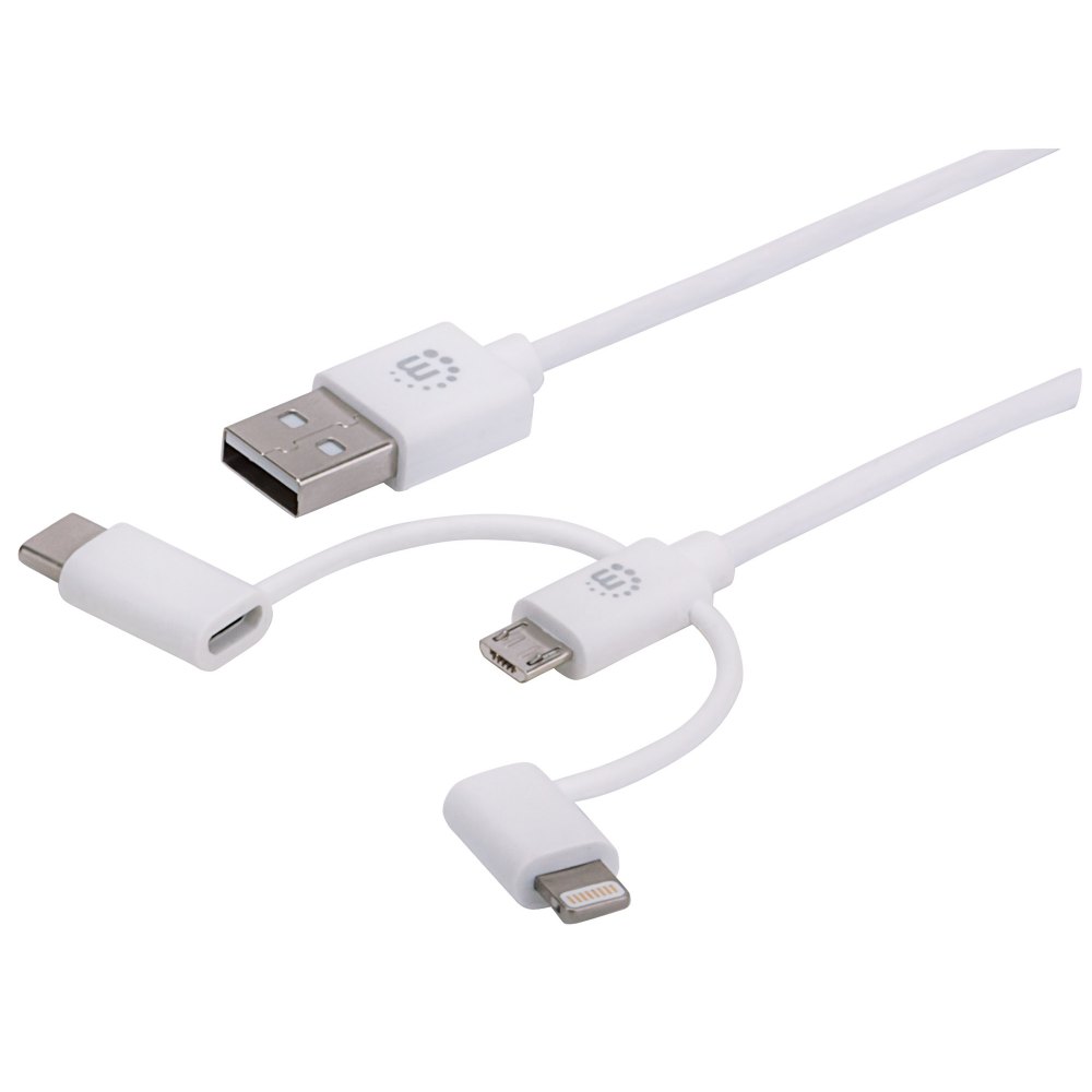 Kabel USB Manhattan 353434 – Uniwersalny Kabel 3w1 USB-A na Lightning / USB-C / Micro-USB, 1m, Biały, do Ładowania oraz Synchronizacji Urządzeń Mobilnych