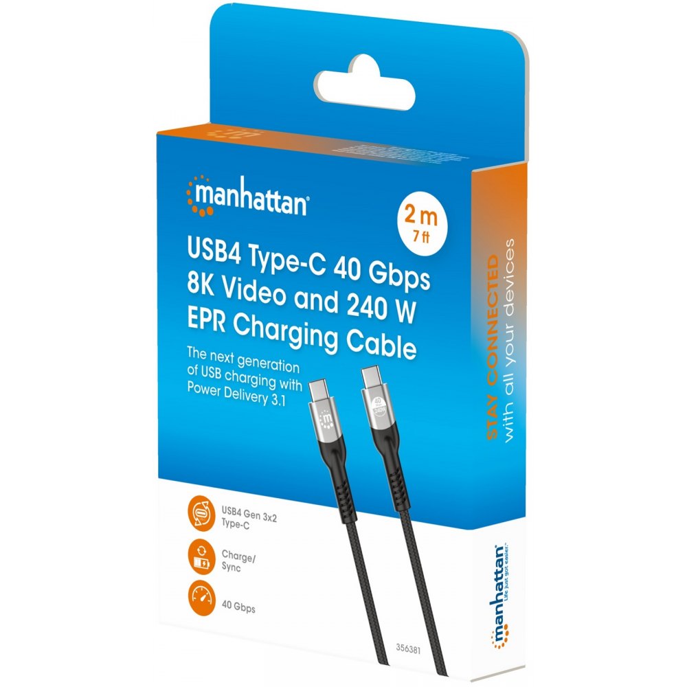 Przewód USB Manhattan 356381 – Kabel USB4 Gen 3x2 Typ-C, Długość 2m, 40 Gb/s, 8K*60Hz Video, Power Delivery 3.1 240W EPR