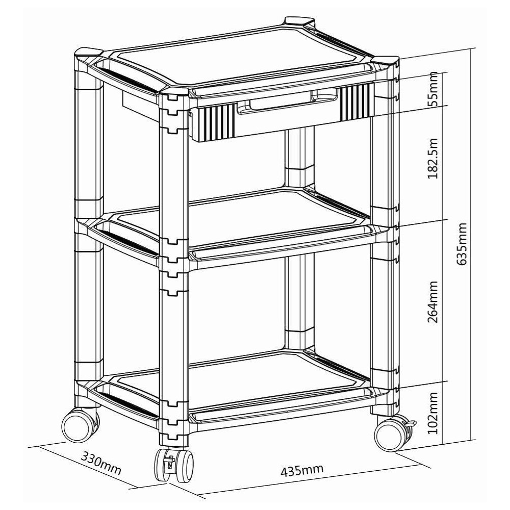 - Modułowy kontener biurowy na kółkach z trzema półkami oraz szufladą