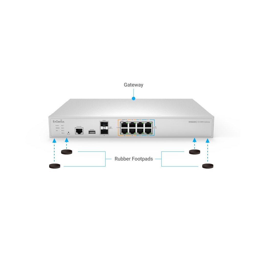 EnGenius Cloud Managed ESG620 to bramka bezpieczeństwa SD-WAN z czterordzeniowym procesorem 2,2 GHz obsługuje podwójną sieć WAN na portach SFP+ i WAN 2,5 GbE oraz aż do ośmiu sieci LAN 2,5 GbE, w tym 4 sieci PoE+. Z funkcjami takimi jak automatyczna sieć VPN typu site-to-site i klient, równoważenie i przełączanie awaryjne sieci WAN oraz stanowa zapora sieciowa, bramka jest kompleksowym rozwiązaniem sieciowym zapewniającym łatwą konfigurację i silne bezpieczeństwo na poziomie enterprise.
