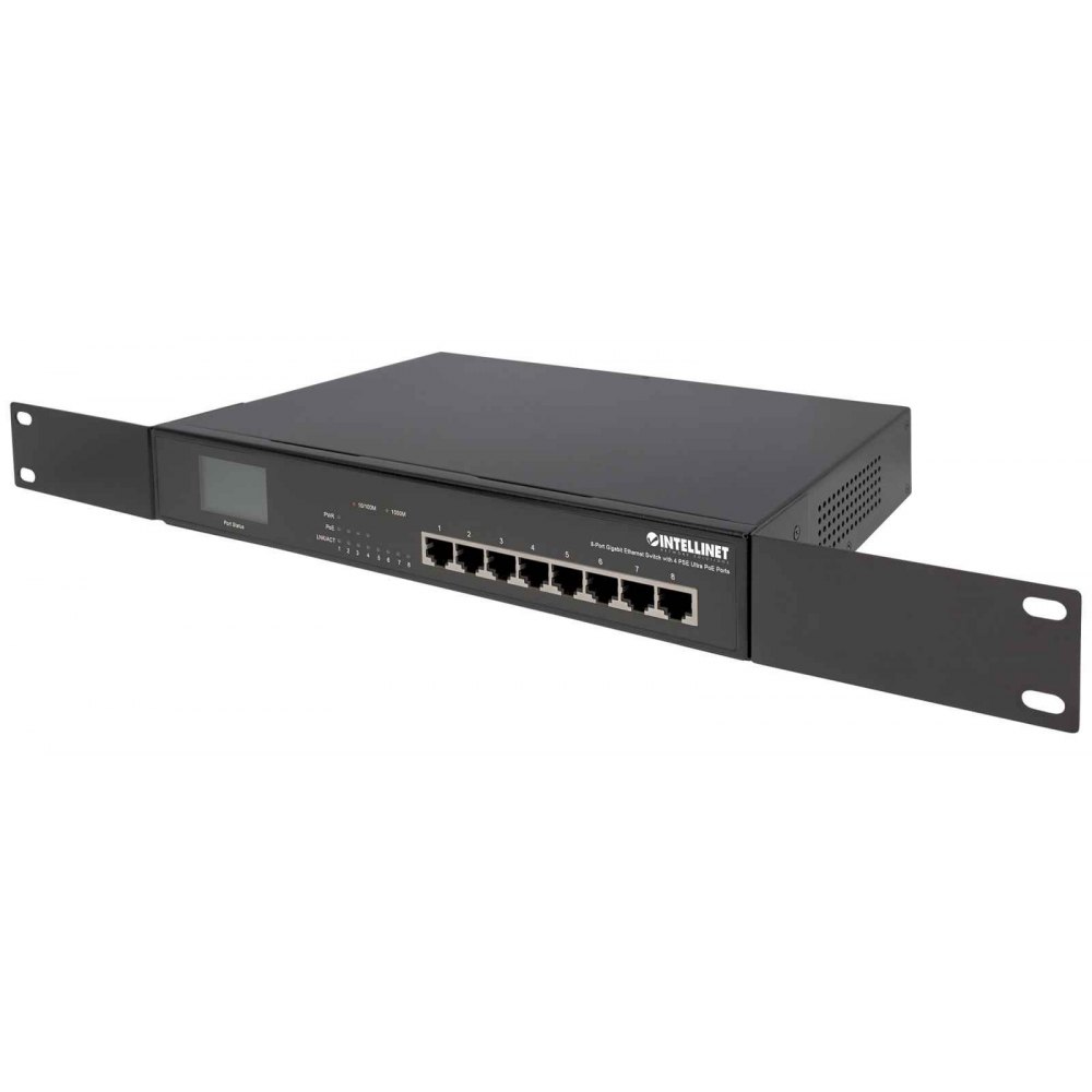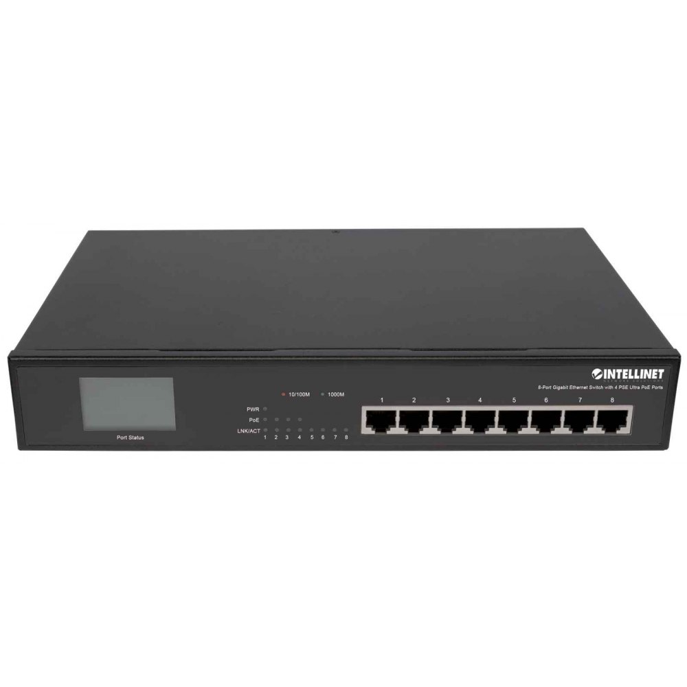 - 8-portowy przełącznik Gigabit Ethernet z 4 portami Ultra PoE i wyświetlaczem LCD