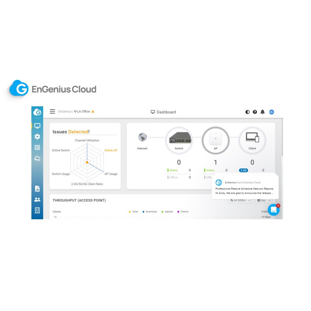 - Darmowa chmura - bardzo obszerna darmowa opcja podstawowa oprogramowania EnGenius Cloud nie wymaga wykupienia licencji ani opłaty abonamentowej, płatne licencje wyłącznie do bardziej zaawansowanych funkcji