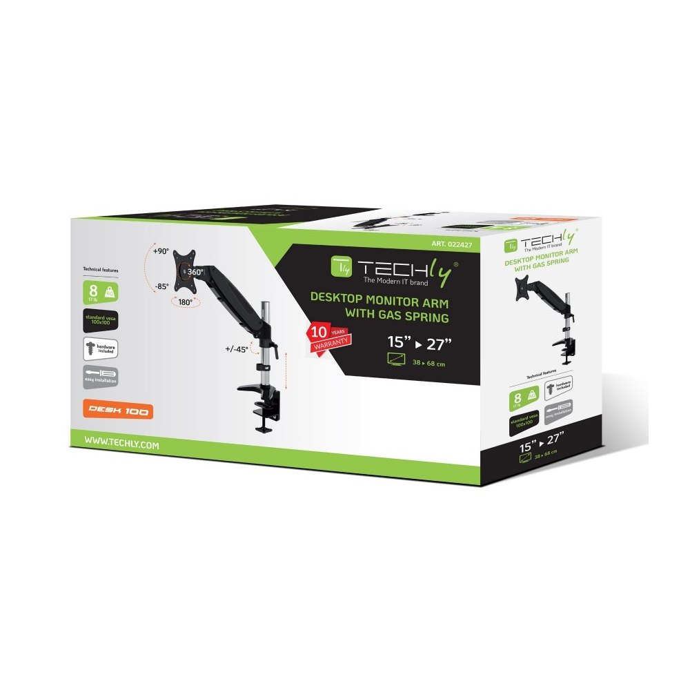 Ramię Monitora Techly ICA-LCD 111-BK, PN: 022427 – Uchwyt Biurkowy do Monitora LED/LCD 15” - 27” do 8kg z Amortyzatorem Gazowym, Obrotowy