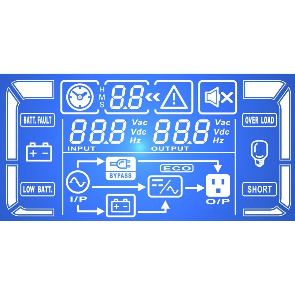 - Wyświetlacz LCD: poziom obciążenia, poziom akumulatora, tryb AC, tryb akumulatorowy, tryb obejścia i wskaźnik awarii.